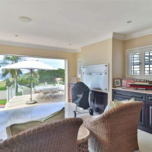 Remote-operated roller shutters provide a flexible divide between the covered entertainment space and the open patio, which provides a breathtaking stage for gazing out at the ocean. Here, you can unwind on the pool loungers or savor a meal at the dining table while the gentle symphony of the waves serenades your senses.